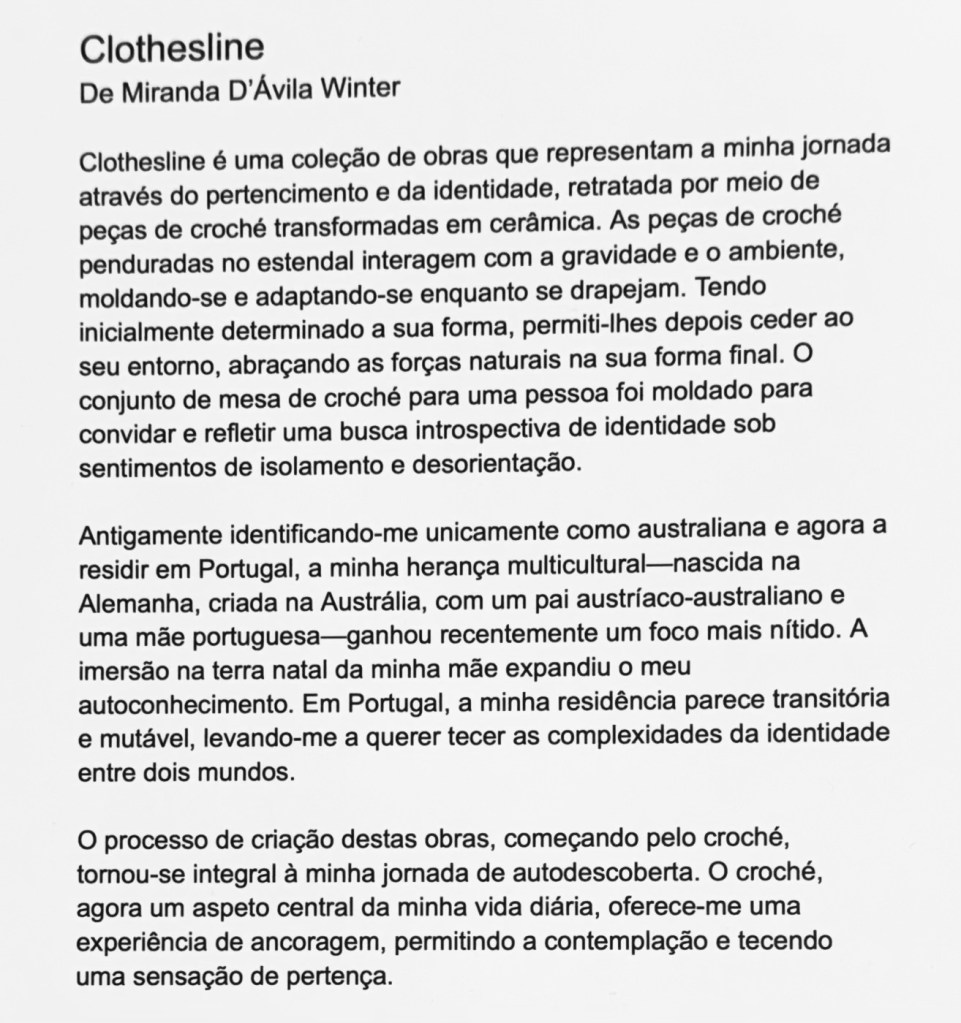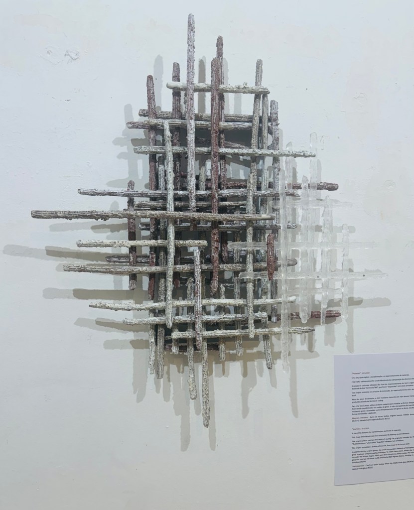 Esta exposição explora a viagem, a aprendizagem entre cerâmica e vidro, onde cada peça conta uma história única. As obras mostram a dualidade entre a fragilidade aparente e a resistência real, exemplificando o equilíbrio entre força e delicadeza.