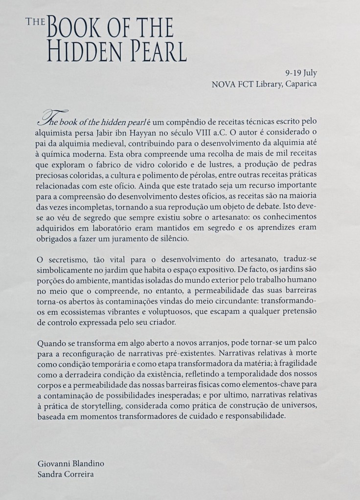 “The book of the hidden pearl” is a compendium of technical recipes written by the Persian alchemist Jabir ibn Hayyan in the 8th century BCE. He is considered as the father of medieval alchemy and as the facilitator of the development of alchemy into modern chemistry. The treatise is constituted by a recollection of over one thousand recipes, dealing with the manufacture of coloured glass, the making of lustre glass, the production of coloured gemstones and the culture and polishing of pearls and other practical recipes related to this craft. Even if the treatise is an important resource in the understanding of the advancement of these crafts, the recipes are most of the time incomplete, making their replication an object of debate amongst the interpreters. This is due to the fact that there has always been a veil of secrecy casted over craftsmanship: the skills achieved in the laboratories were kept private and the apprentices were obliged to swear an oath of silence. The element of the secret, which was so vital to the development of crafts, is symbolically translated in the garden that inhabits the exhibition space. Gardens are, in fact, portions of the environment kept secluded by human labour from the surroundings, the out-world. Nonetheless, the permeability of their barriers, makes the gardens open to contaminations coming from the surroundings: they turn into vibrant and voluptuous ecosystems, that escape any pretence of control expressed by their maker. Once it grows into something open to new arrangements, it can become a stage for the reconfiguration of pre-existing narratives. Narratives concerning death as a temporary condition and as a transformative stage of matter; frailty as the ultimate condition of existence, reflecting both the temporality of our bodies and the permeability of our physical boundaries, a key to unexpected contaminations and possibilities; and, ultimately, concerning the practice of storytelling itself, considered as a world-building practice, based on transformative instances of caring and responsibility.